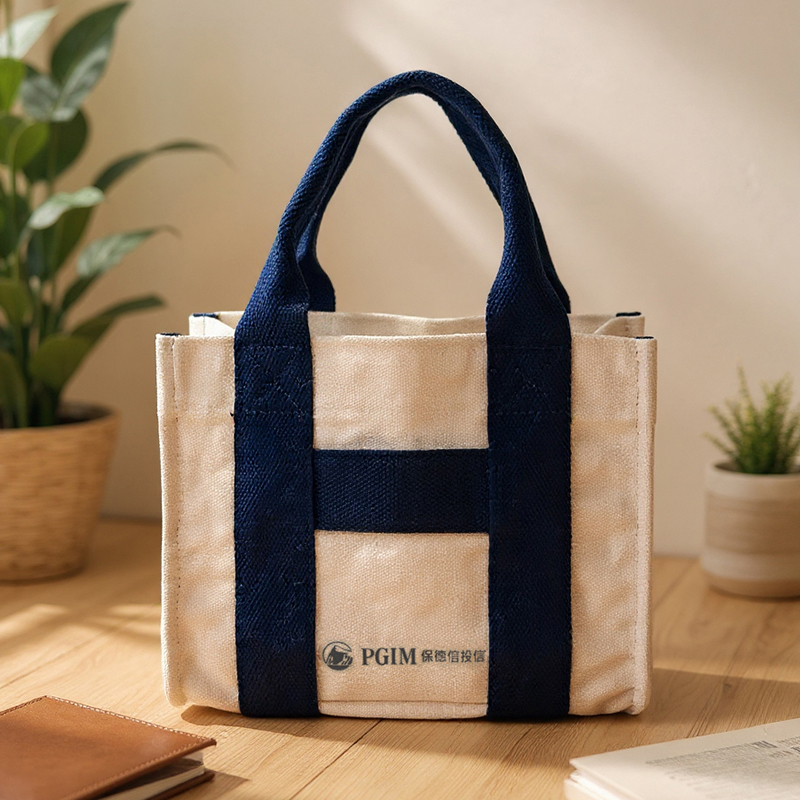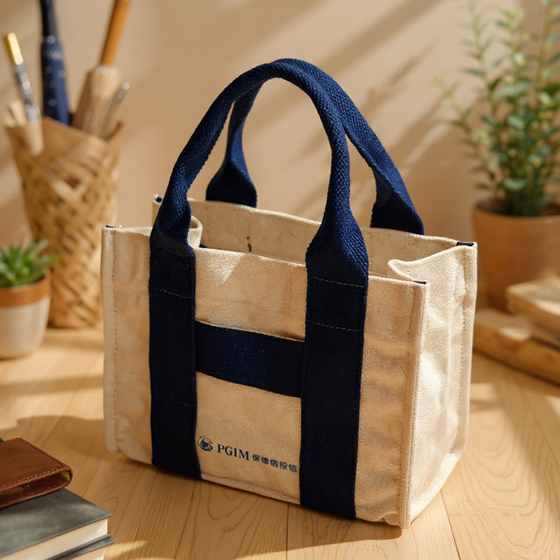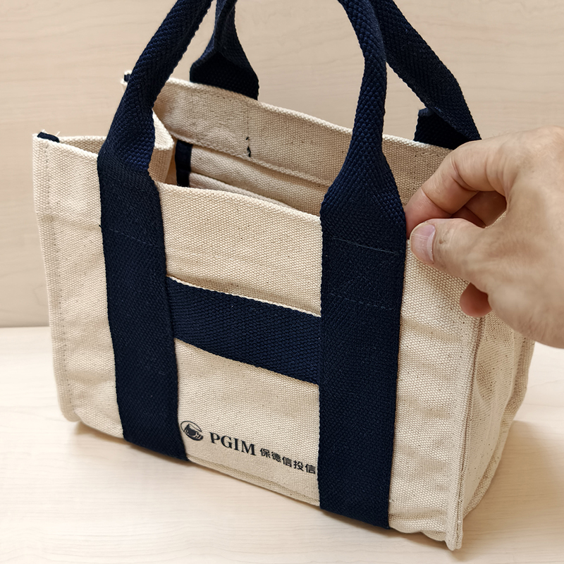 商品名稱| 帆布提袋 商品尺寸| 23.5 × 11.5 × 18 cm 商品重量| 約 215g 商品材質| 厚磅帆布 商品特色: 這款由保德信投資訂製的帆布提袋,採用厚磅帆布精製而成,袋體挺立有型,兼具質感與實用性。米白色袋身搭配深藍色加寬提帶,展現專業穩重的品牌形象,正面印有「PGIM 保德信投資」Logo,低調卻極具辨識度。